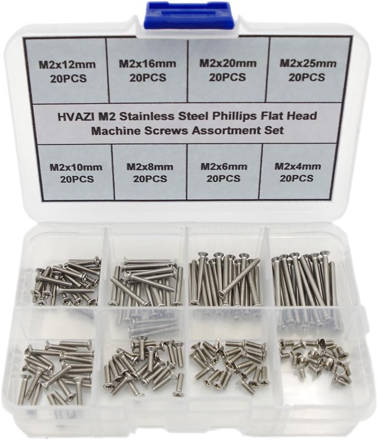HVAZI 160pcs Metric M2 304 Stainless Steel Phillips Flat Head Machine Screws Assortment Kit in a plastic box